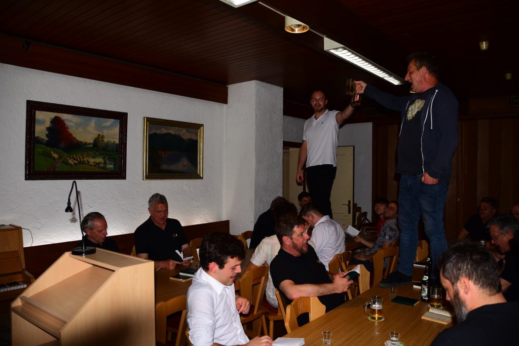 Mit Einbruch der Dunkelheit setzte leider auch Regen ein. Doch anstatt die Stimmung zu trüben, verlagerte sich das gesellige Beisammensein kurzerhand in den Kleinen Saal. Dort übernahm ein erfahrener Bierorgler der Ambronia die musikalische Leitung, und schon bald erfüllte fröhlicher Gesang das ganze Haus. Die ausgelassene Stimmung und der Austausch waren deutlich spürbar. Ein Abend, der allen in bester Erinnerung bleiben wird.